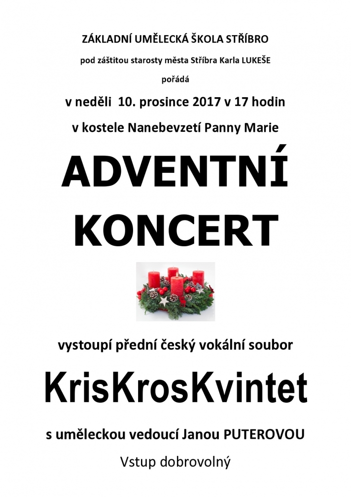 ZUŠ Stříbro pod záštitou starosty města Stříbra Karla Lukeše pořádá v neděli 10. prosince 2017 od 17:00 hodin v kostele Nanebevzetí Panny Marie