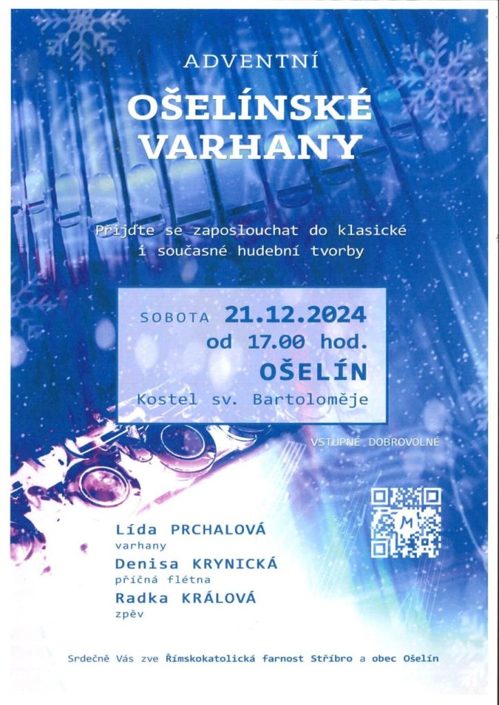 Srdečně vás zveme na sváteční koncert klasické i současné hudební tvorby, který se koná 21. prosince 2024 od 17:00 hodin v kostele sv. Bartoloměje v Ošelíně. Na varhany zahraje Lída Prchalová, na příčnou flétnu Denisa Krynická a zpěv obohatí Radka Králová. Akci organizuje Římskokatolická farnost Stříbro a obec Ošelín.