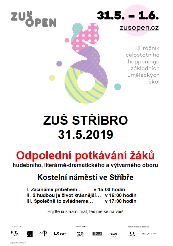 Odpolední potkávání žáků hudebního, literárně-dramatického a výtvarného oboru. Kostelní náměstí ve Stříbře I. Začínáme příběhem… v 15:00 hodin II. S hudbou je život krásnější… v 16:00 hodin III. Společně to zvládneme… v 17:00 hodin Přijďte si s námi hrát, těšíme se na vás!