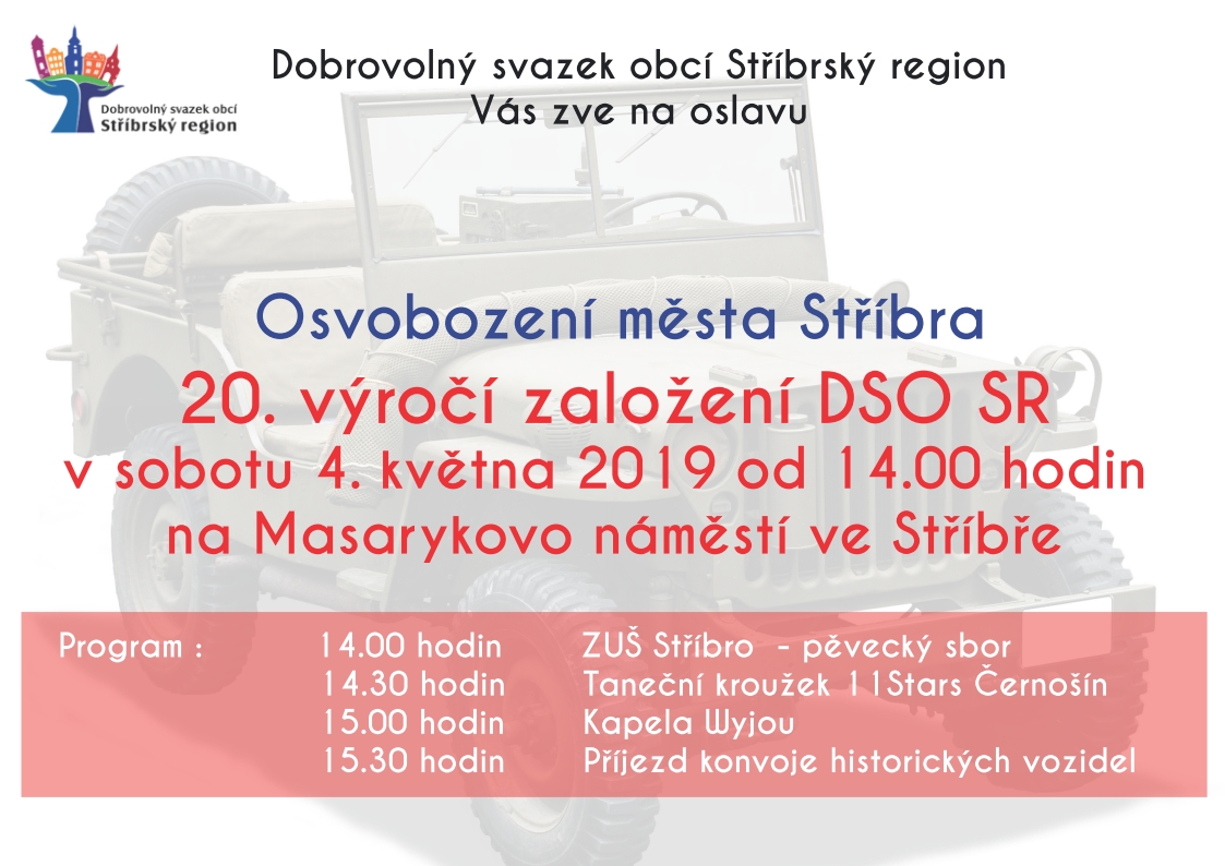 Dobrovolný svazek obcí Stříbrský region Vás zve na oslavu Osvobození města Stříbra 20. výročí založení DSO SR v sobotu 4. května 2019 od 14:00 hodin na Masarykovo náměstí ve Stříbře