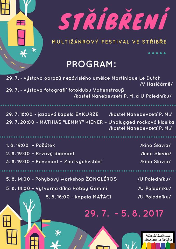 Na přelomu července a srpna zažijete ve Stříbře STŘÍBŘENÍ - multižánrový festival, který přinese koncerty, výstavy pod širým nebem, workshopy pro děti, filmové lahůdky v kině Slavia a mnohé další. Podrobný rozpis akcí nejdete během července na www.mks-stribro.cz