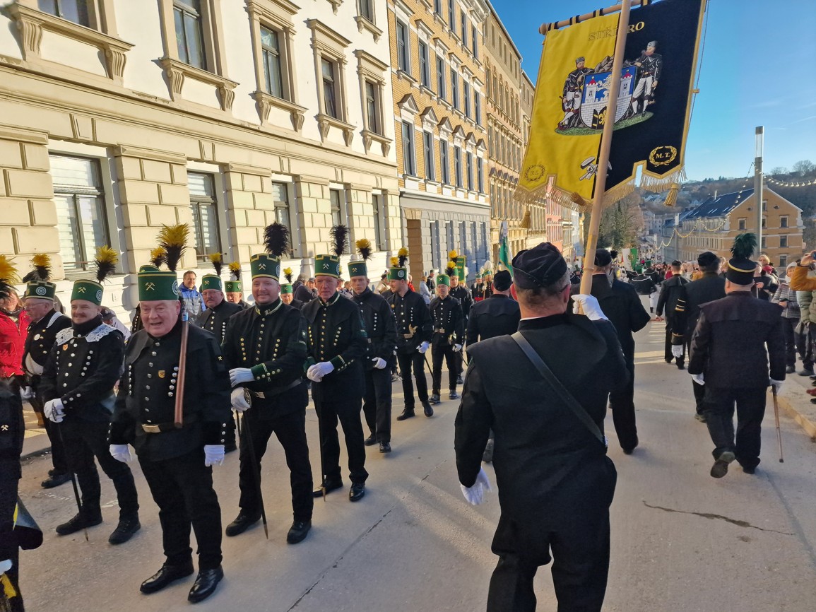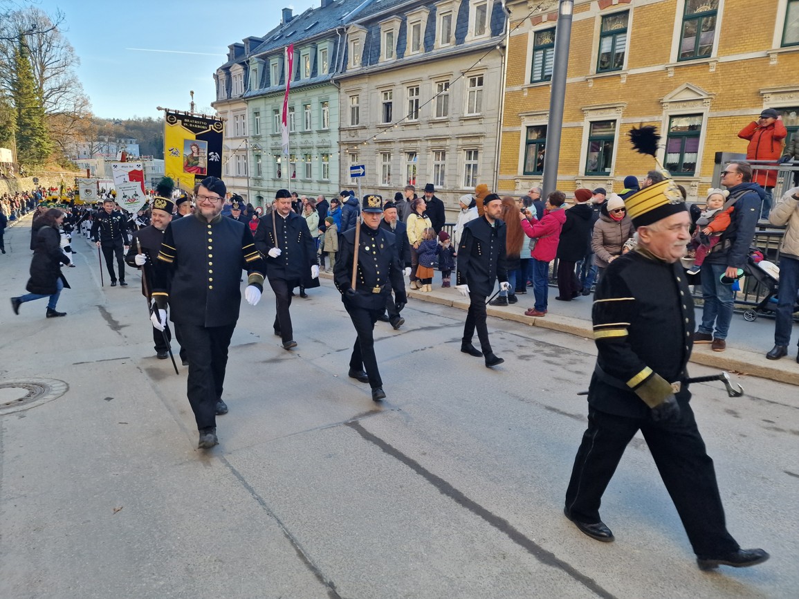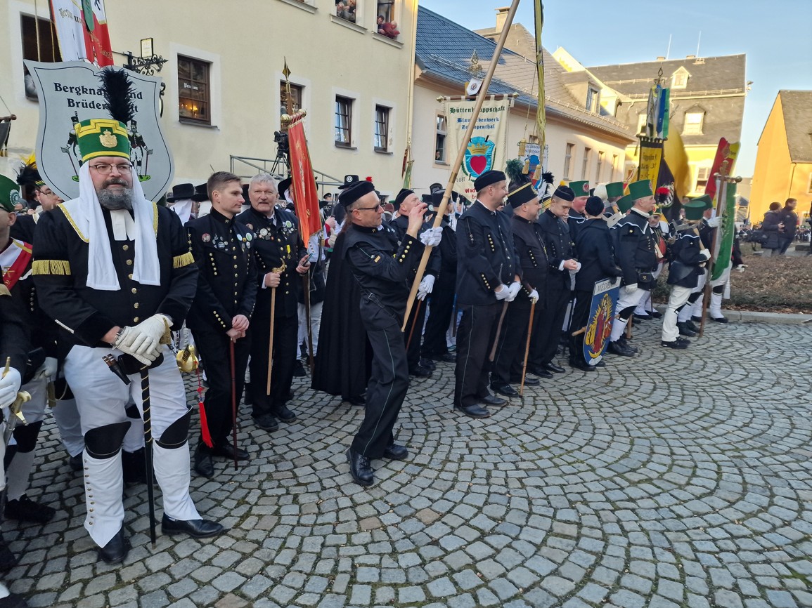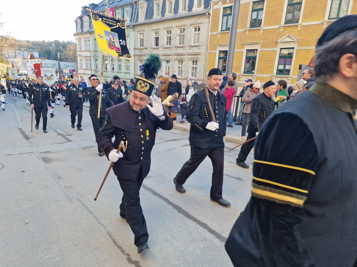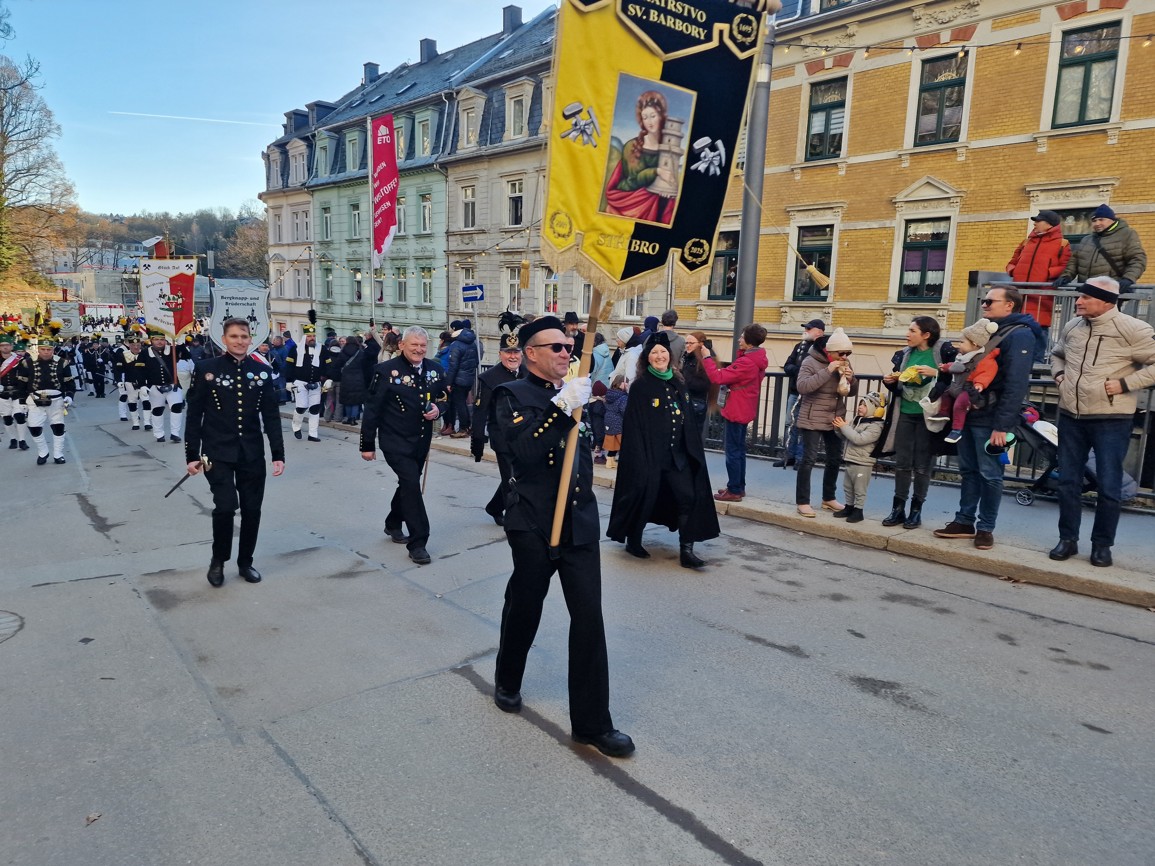 V nedělním dopolední 21. prosince vyrazili členové Bratrstva sv. Barbory na pozvání kamarádů z hornických Vejprt do sousedního Annabergu – Buchholzu na poslední adventní velkou hornickou parádu (grosse bergparade). Dopoledne jsme si prošli vánočně vyzdobené město, prohlédli trhy a psychicky se připravovali na akci. Město se mezi tím zaplnilo k prasknutí. Ti co jedou na poslední chvíli parkují i 4 km daleko. Slavnostní hornický průvod se řadí u autobusového nádraží a úderem 13,30 hod se vydává na pochod. Jako vloni je účastníků v průvodu cca 1 300 osob, z toho je 8 hornických kapel. V polovině trasy se průvod otočí proti sobě, takže krásně vidíte všechny účastníky, což se ve většině průvodů neděje. Velká škoda.